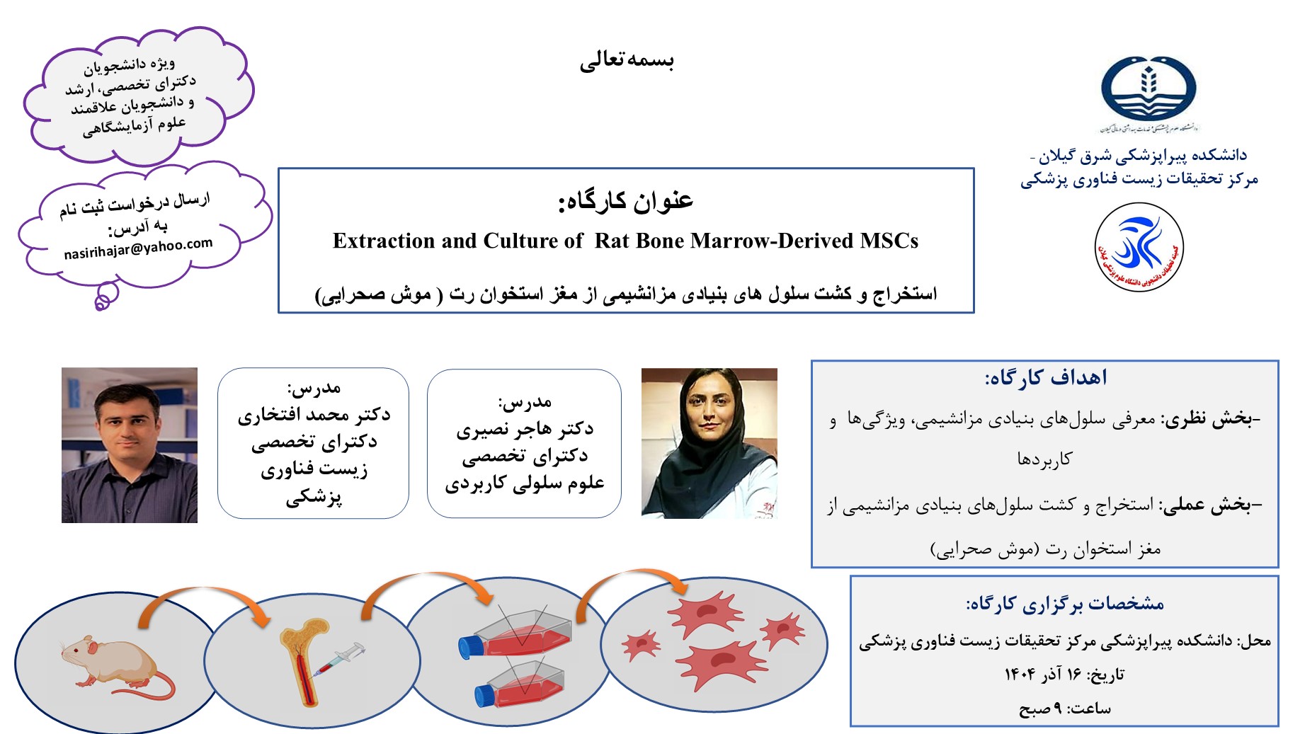 به اطلاع می رساند کارگاه نظری و عملی" استخراج و کشت سلولهای بنیادی مزانشیمی از مغز استخوان رت ( موش صحرایی) توسط سرکار خانم دکترهاجر نصیری و آقای دکتر محمد افتخاری توسط مرکز تحقیقات زیست فناوری پزشکی و کمیته تحقیقات دانشجویی در تاریخ 16 آذر ماه در دانشکده پیراپزشکی واقع در مرکز تحقیقات زیست فناوری پزشکی برگزار می گردد. ساعت شروع کارگاه 9 صبح می باشد. لذا علاقمندان به حوزه پزشکی بازساختی جهت شرکت در کارگاه به ایمیل زیر درخواست ارسال نمایند.